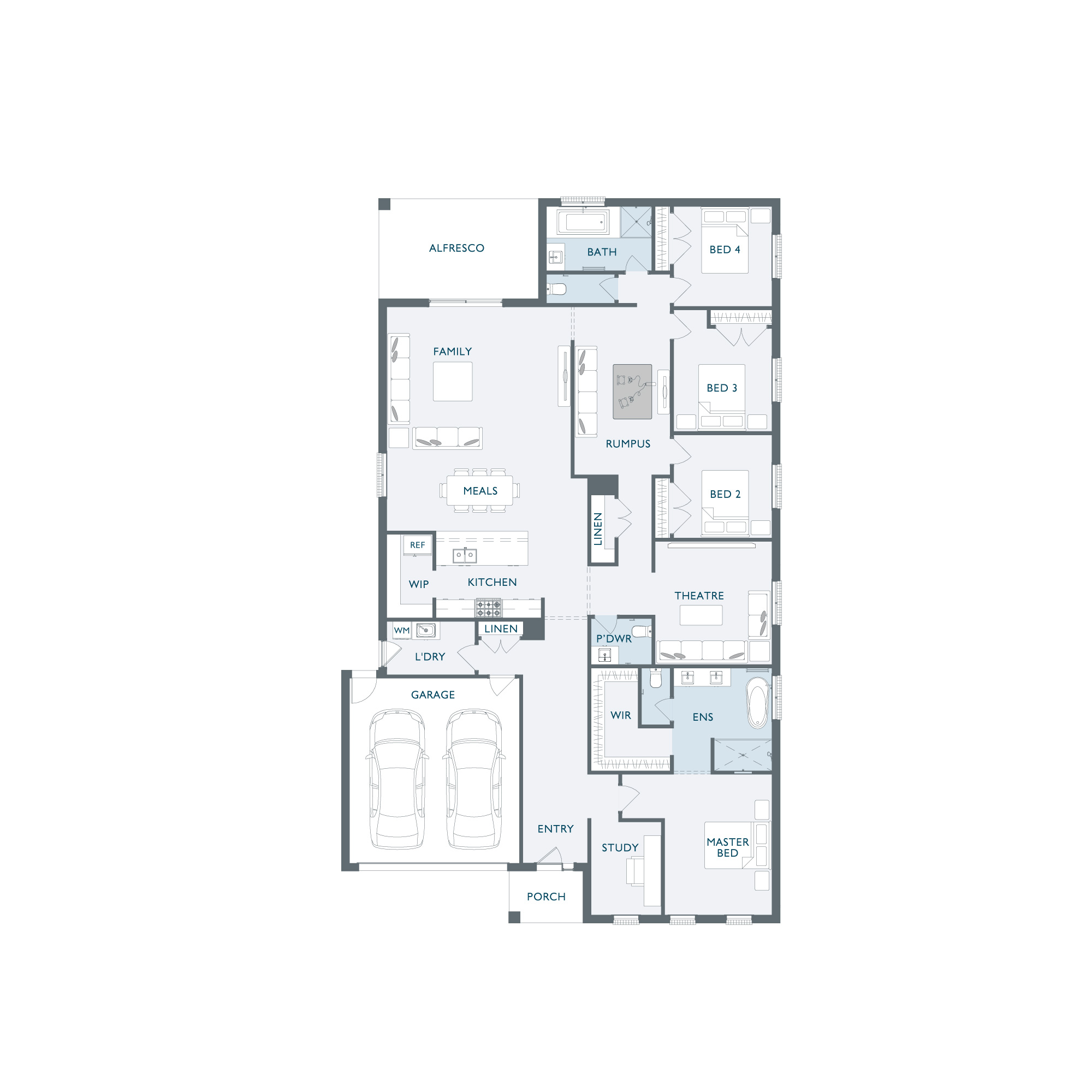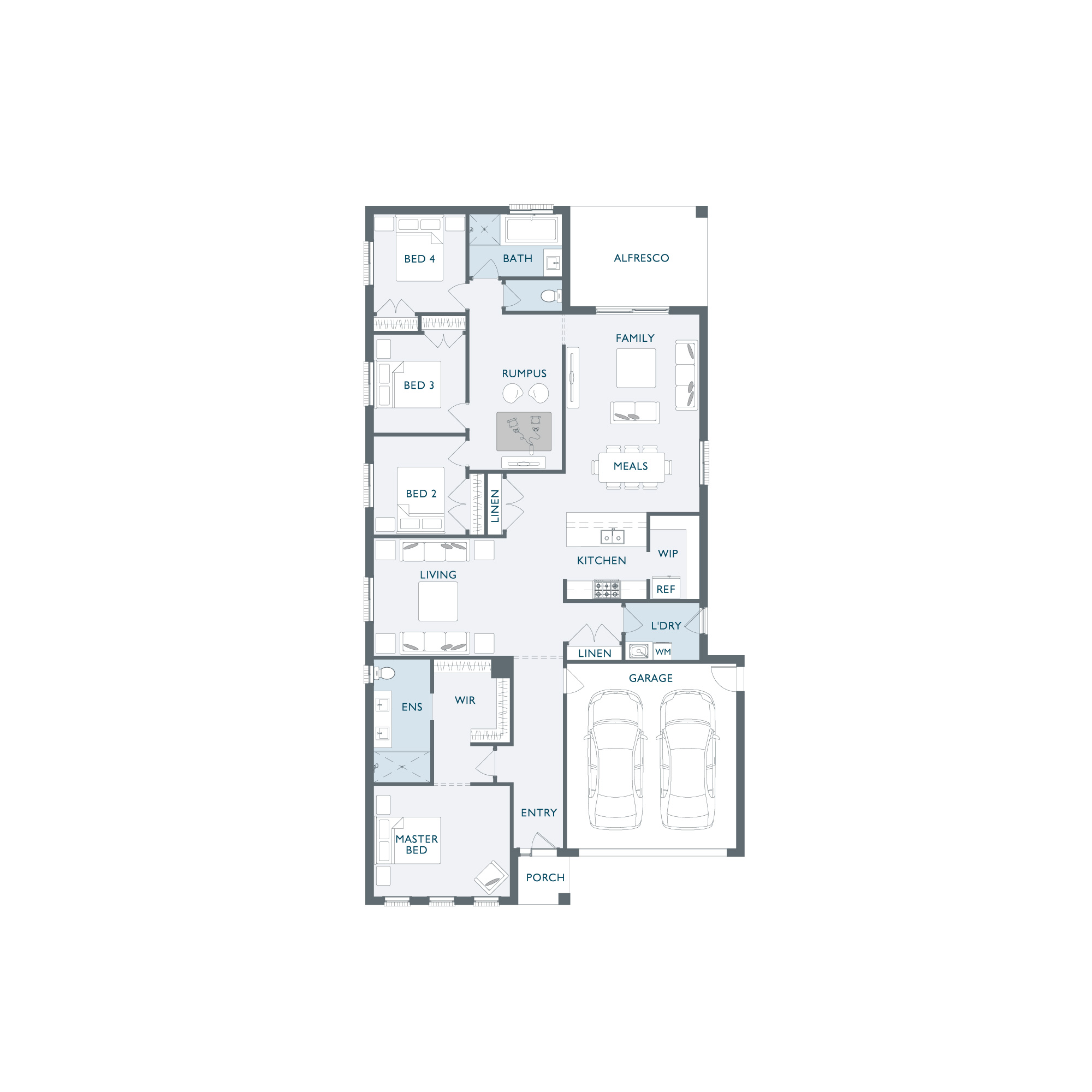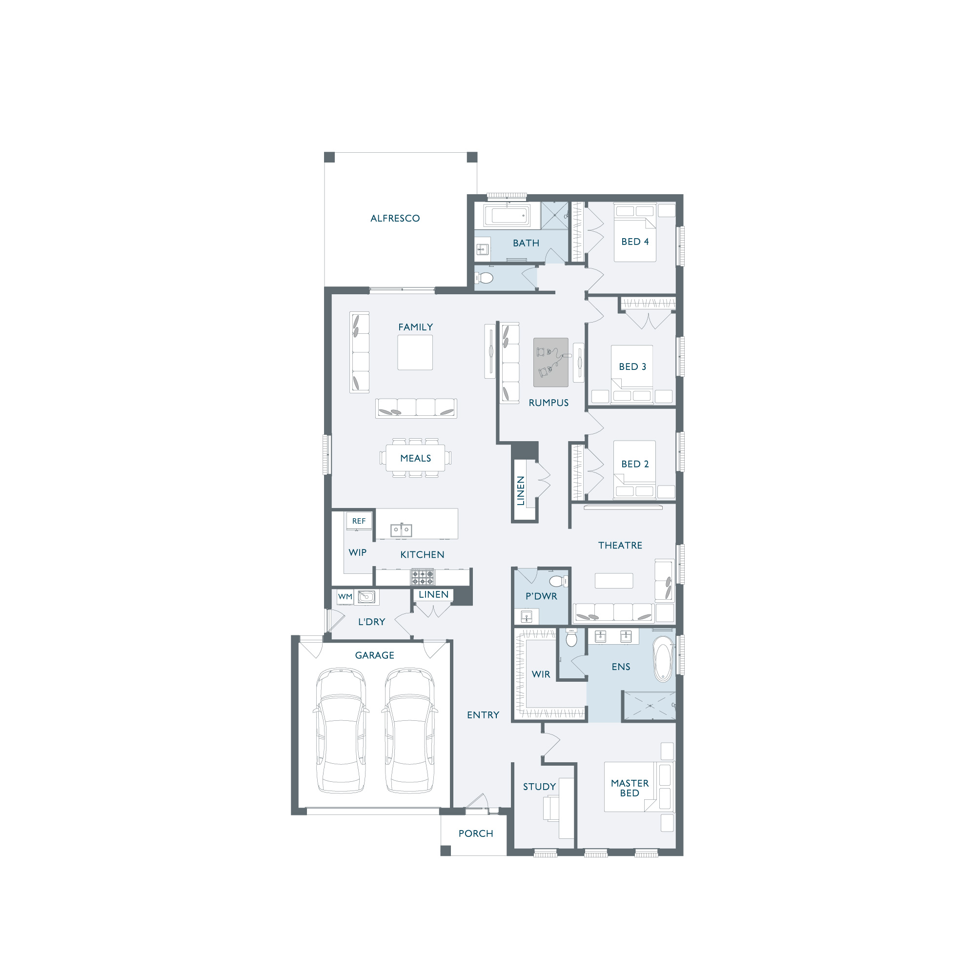 Vecchio forms the perfect foundation ideal for any growing family. Open plan living has been carefully paired with zoned areas capturing the perfect combination of seclusion and space. The impressive Master Suite has been positioned to the front of the home allowing for privacy, while the three secondary bedrooms ingeniously surround a kid’s retreat creating another private area for entertaining.